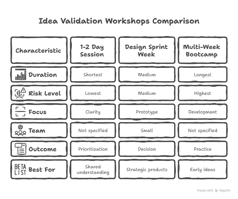 For low-risk ideas, 1–2 day workshops can be enough. For strategic digital products, a 4–5 day Design Sprint–style week is often better, while multi-week bootcamps suit early-stage or high-uncertainty ideas.